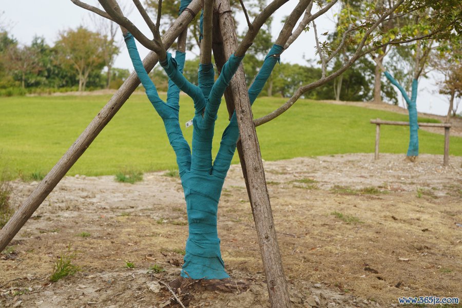 陈嫣妮和共事又找来蓝绿色的布条,把一些得不到荫蔽的魁岸树干包得严严密实。每隔七到十天,就对易晒伤的树叶打一次扼制蒸腾的药剂。